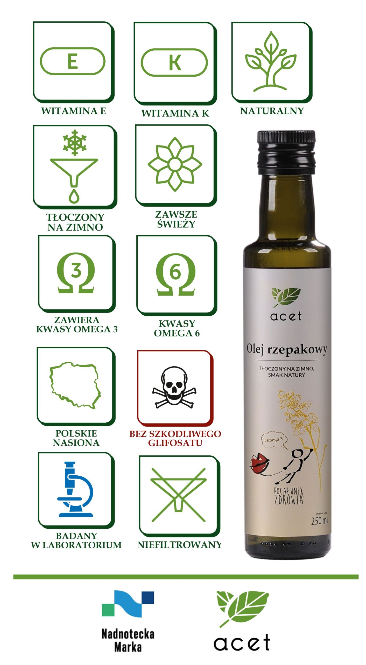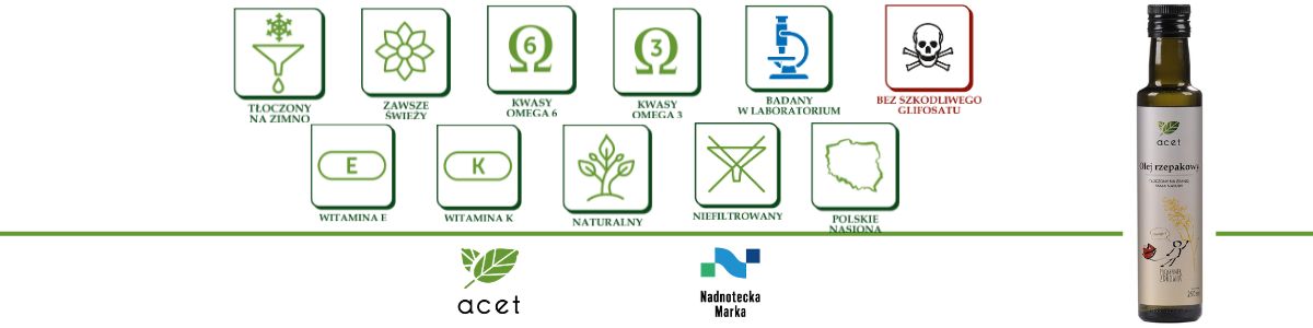 • Bezpieczny – w przeciwieństwie do wielu olejów, nasz jest badany na obecność glifosatu – nie zawiera tego niebezpiecznego związku, stosowanego często do suszenia nasion przed zbiorem.