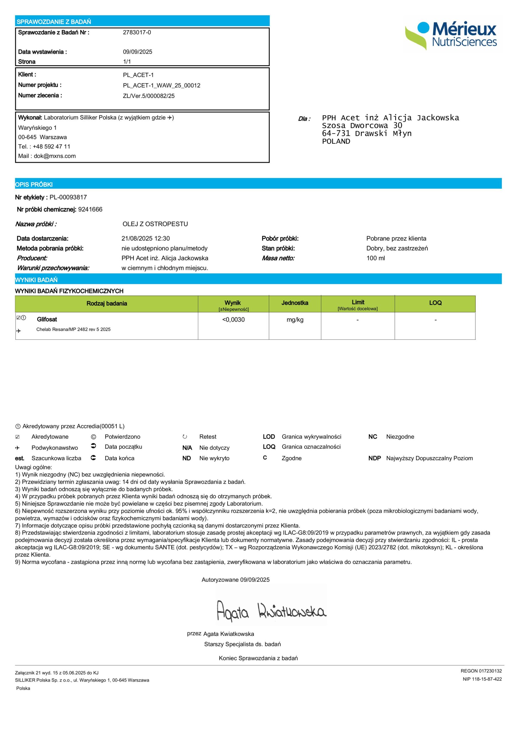 Nasz olej z ostropestu został przebadany pod kątem obecności glifosatu – jednej z najczęściej stosowanych substancji w rolnictwie. Wynik jest jednoznaczny: nie wykryto pozostałości glifosatu (<0,0030 mg/kg).