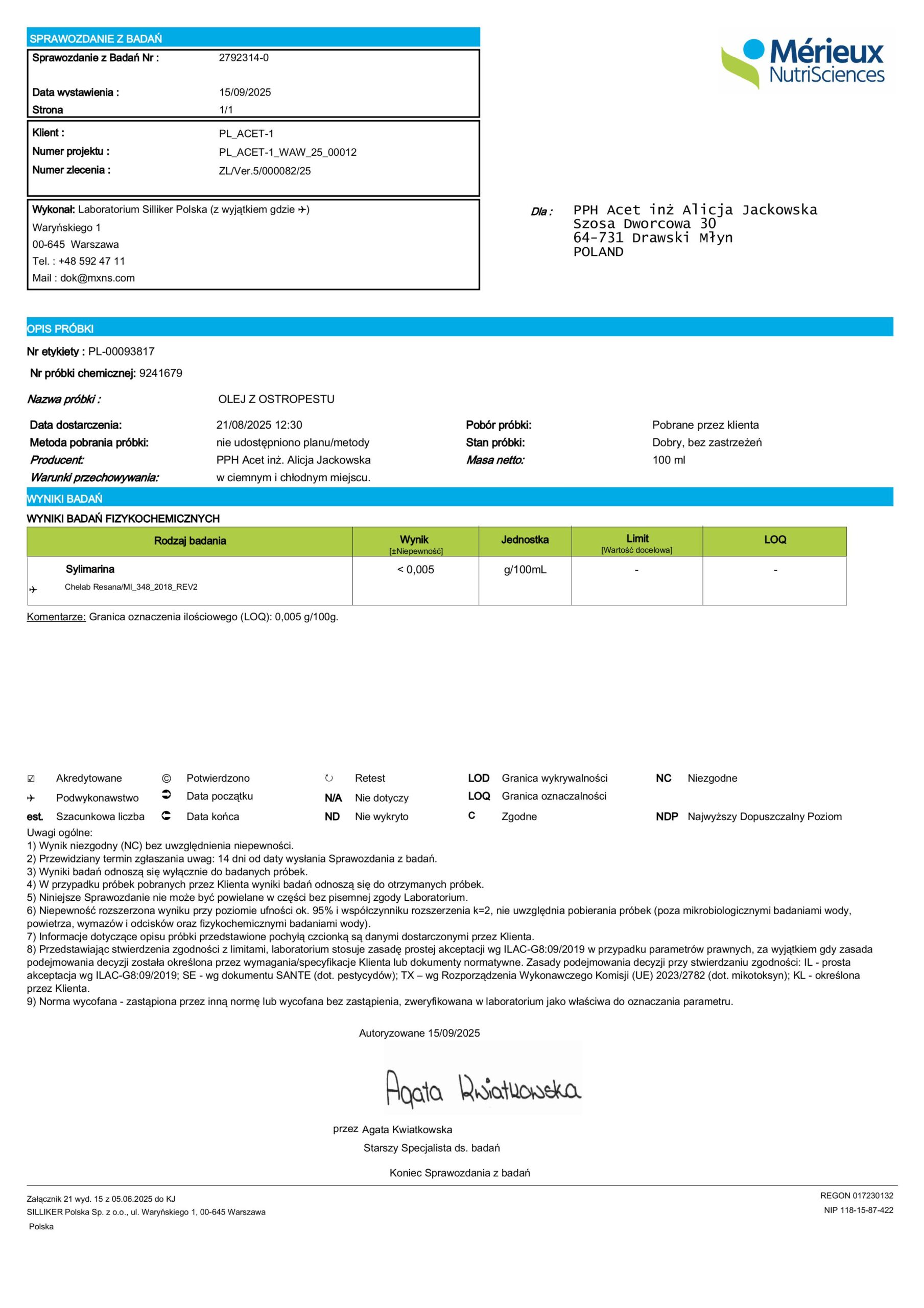 Poniższe to badanie dotyczy oleju z ostropestu i sprawdza zawartość sylimaryny – związku o działaniu ochronnym i regenerującym wątrobę. Wynik: < 0,005 g/100 ml (nie wykryto w granicy oznaczalności)